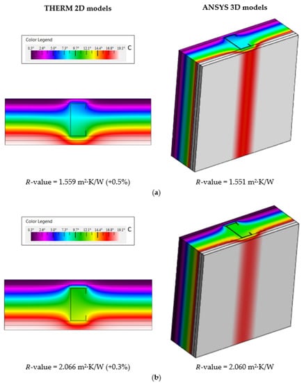 The last accuracy verification was performed by comparing the THERM 2D model results for the LSF partitions with some 3D models implemented in the ANSYS software []. The thermal conductivities of the modelled materials are presented in Table 1 and Table 2; the LSF partition wall dimensions and geometry are displayed in Figure 1; and for the boundary conditions, the values used in the models are the values presented in Section 2.4.2. Figure 3 displays the distribution of temperature and the computed conductive thermal resistances (-values) for the reference LSF partition wall (Figure 3a) and for an LSF partition with an outer TBS (Figure 3a), using both 2D and 3D models. The modelled TBS was 50 mm wide, 10 mm thick, and had a thermal conductivity equal to 30 mW/(m‧K). The obtained 2D and 3D models’ -values were very similar (+0.5% and +0.3% difference), highlighting again the excellent THERM [] model accuracy.
