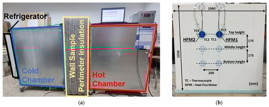 To validate the THERM model, experimental measurements were performed under laboratory-controlled conditions (Figure 4) using a test sample of the reference LSF partition wall. This test-sample LSF wall was placed between two climatic chambers, as illustrated in Figure 4a. Electrical thermal resistance was used to heat the hot chamber, while a refrigerator was used to cool the cold chamber. The wall sample perimeter was covered by 80 mm foam insulation made of polyurethane with a thermal conductivity equal to 0.036 W/(m·K). The objective was to mitigate the heat losses across the sample wall’s perimeter, as shown in Figure 4a.