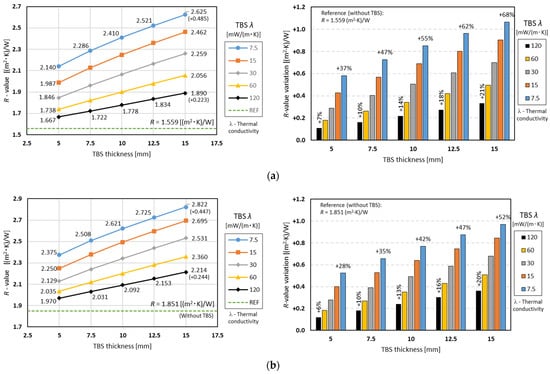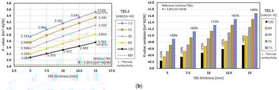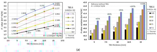 Looking to the other evaluated TBS thermal conductivities, the slope of the corresponding -value lines also increased with the decreasing TBS conductivity. Once again, the major -values were reached for the smaller TBS thermal conductivity (7.5 mW/m/W), ranging from 2.569 m2·K/W (5 mm thick, +65%) up to 3.419 m2·K/W (15 mm thick, +119%).