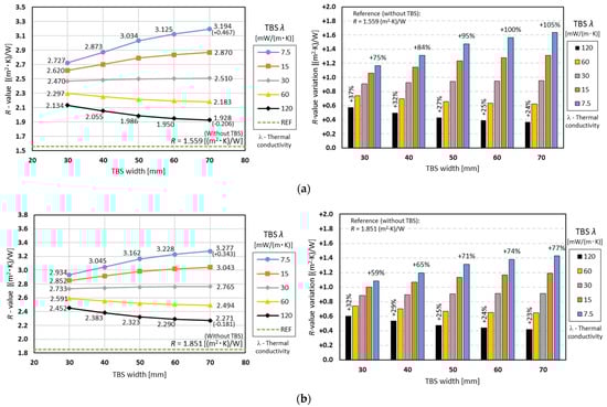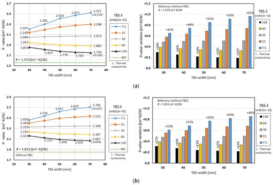Figure 6a illustrates the conductive thermal resistance values obtained for the partition LSF walls with one attached TBS of 10 mm thickness and variable width, for a 400 mm steel stud spacing, as well as the -values variation relative to a reference wall (without TBS). The -values for the higher thermal conductivity (120 mW/m/W), black line, even for a 30 mm width and 10 mm thickness, showed that TBS increases thermal performance from 1.559 m2·K/W (reference value) to 1.855 m2·K/W (+19%).