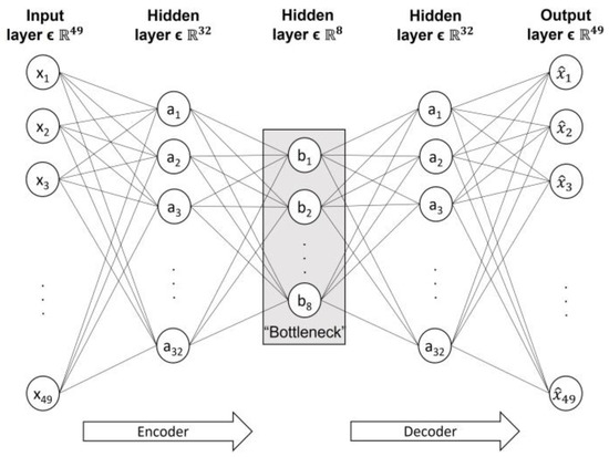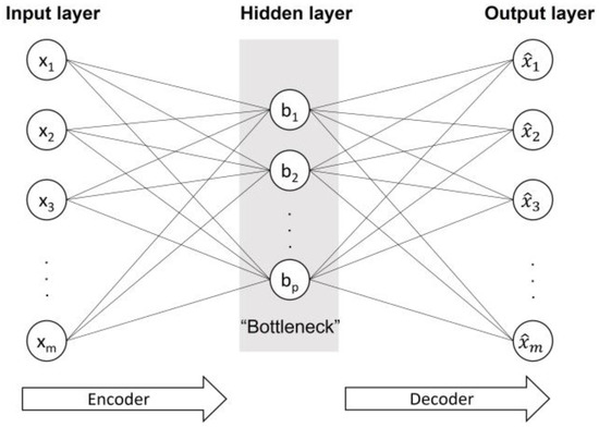 Dimensionality reduction using an autoencoder belongs to unsupervised learning techniques, where the output is not used for learning. In this case, the autoencoder consists of the same number of nodes in the input and output layers, hence corresponding to the first and last layers, respectively. Figure 1 shows an illustration of an autoencoder that consists of the encoder part and decoder part and one hidden layer, which is called the bottleneck layer. The bottleneck layer is often used as the new feature set when using an autoencoder for dimensionality reduction. Although the autoencoder is trained to perform the input-copying task, the bottleneck layer includes salient properties of the dataset, given that its dimension is much smaller than the dimension of the input space. Nevertheless, a drawback for undercomplete autoencoders is that if the width of the encoder and decoder is too large, the autoencoder fails to extract something useful from the dataset.