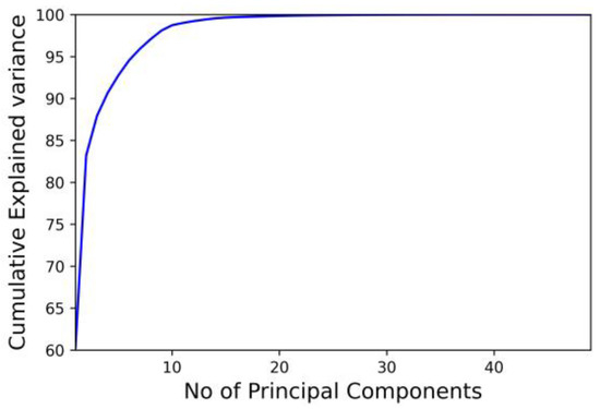 Figure 2 demonstrates the cumulative explained variance after increasing the number of PCs each time. In general, PCA produces as many PCs as the number of original input spaces. Because 49 features were available, 49 PCs were extracted, ending up at 100% cumulative explained variance if all of these were taken into consideration. However, 95% of the cumulative explained variance corresponded to the selection of the first seven PCs. Thus, the reduced 7D output space was assumed to be the one accounting for most of the structure in the data after PCA.
