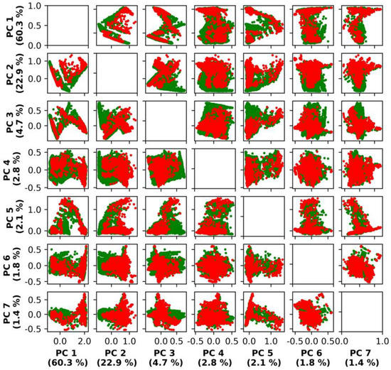 Two-dimensional visualisations of the first seven principal components (green: normal; red: faulty).