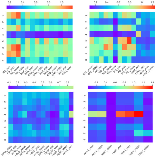 Figure 5 shows the mutual information map between each original feature (horizontal axis) and each dimension of the latent space (vertical axis) of the developed model (autoencoder [n,32,8,32,n]). This map provides details about the dependencies between the original and extracted features. The strongest effect is marked with red colour, whereas the weakest effect is marked with violet colour, as shown in the colour bars of Figure 5. Therefore, for features that have the highest mutual information scores, this implies that those features had the largest effect on the new extracted features.