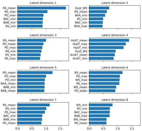 For instance, the average hub temperature had the highest dependency on the fourth latent dimension. The average rotor speed had the highest impact on the first, third, sixth and seventh latent dimensions, whereas the gust wind speed and minimum wind speed had the largest effect on the second and eighth dimensions, respectively. Latent dimension 5 was mostly influenced by the average power output. The top six features that had the greatest influence on each latent dimension are presented in Figure 6. These figures make it more obvious that almost all of the new extracted features depend mostly on the critical characteristic features (CCFs) [27,29], namely, power output, wind speed, the three blade angles and the rotor speed, save for the fourth latent dimension.
