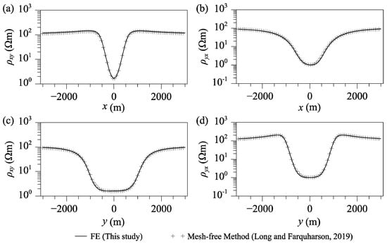 ρyx calculated by the FE and the mesh-free methods are in good agreement with each other. The apparent resistivity data calculated by the FE method are shown in