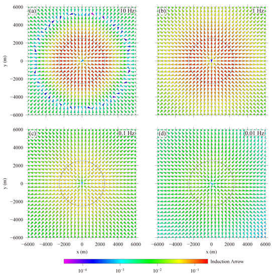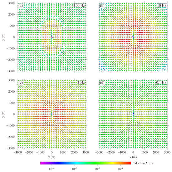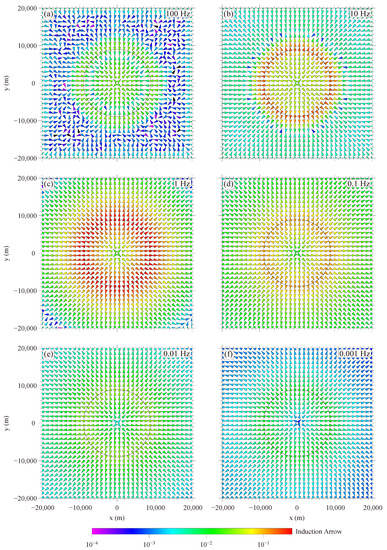 Figure 4). The length of the induction arrows increases as the frequency decreases from 100 Hz to 10 Hz, and then decreases as the frequency decreases.