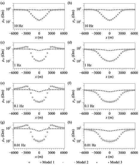 x-coordinate ranges from −3000 m to 3000 m for all frequencies and models. For 10 and 1 Hz, the three apparent-resistivity curves nearly agree with each other between