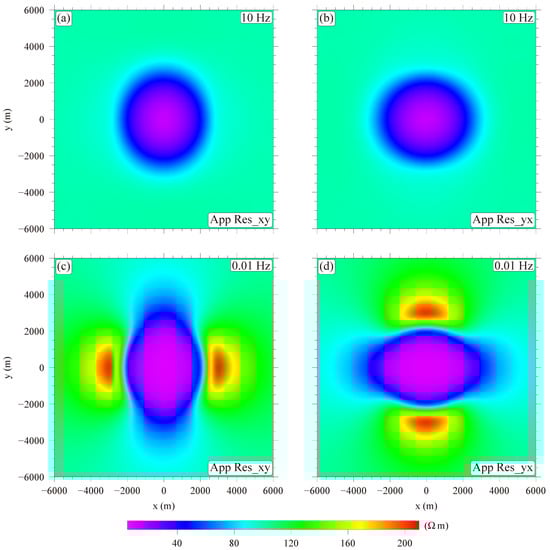 ρyx at 10 and 0.01 Hz for Model 1. The low apparent resistivities only occur in the central domain of these four contour maps (see