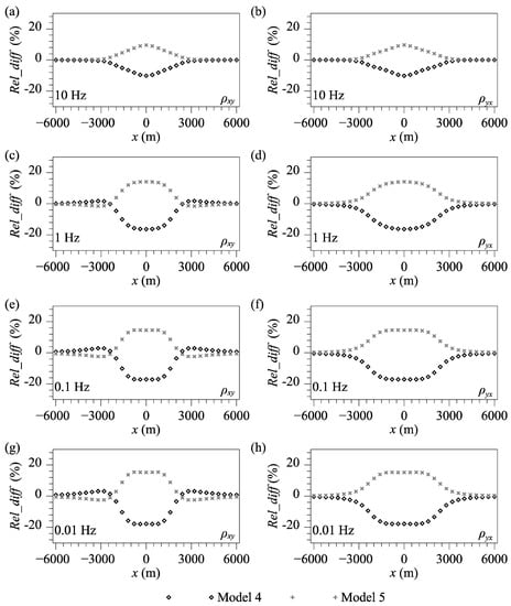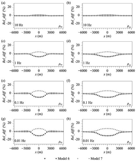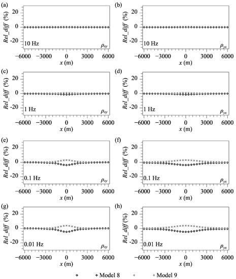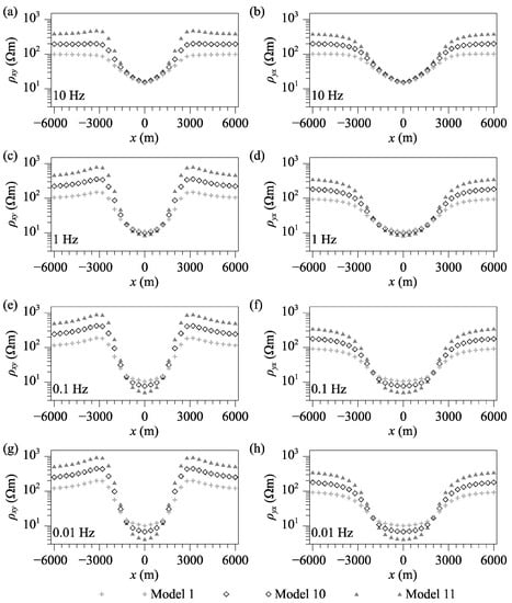 ρyx curves for Model 13 are always symmetrical at all frequencies due to the symmetrical shapes of the clay cap and reservoir. The