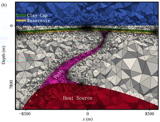 Figure 13, this geothermal system consists of clay cap, reservoir, path, and heat source. The reservoir and the heat source are connected by the heat-conducting path. For both the clay cap and reservoir the thickness was set to 240 m, and the lengths both in the