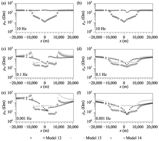 ρyx curves of Model 12 match well with the ones of Model 13 at 10 Hz, and then present a complex shape at 0.1 and 0.001 Hz due to the effects of the path and heat source. It indicates that the total EM responses for the HDR and partial melting system are dominated by the responses caused by the shallow low-resistivity clay cap and reservoir at 10 Hz, and are dramatically affected by the path and heat source at lower frequencies, especially at 0.001 Hz.