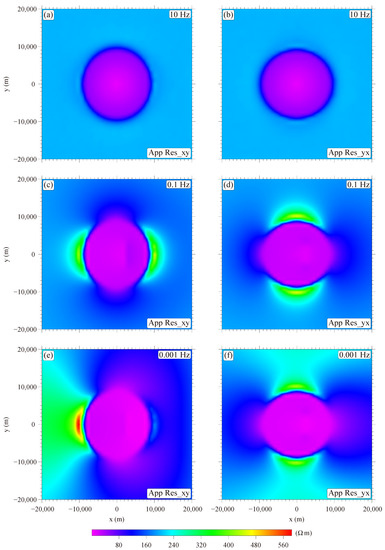 Figure 15). Unlike the symmetrical low-apparent-resistivity domains at 10 Hz, the ones at 0.1 and 0.001 Hz are not symmetrical about the