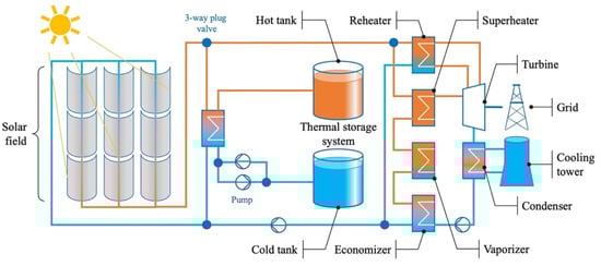 The STPT technology uses semi-cylinders with parabolic sections to concentrate solar energy in the absorber tubes. The main systems of STPT power plants are the solar field, thermal storage (TSS), heat transfer system, and power block (Figure 1). The solar field is basically composed of solar collectors’ modules and a system of tubes (or receivers) through which the heat transfer runs. TSS allows for regulating the dispatch of the energy generated in the power plant, is often measured in hours, and may not be present in an STPT power plant. The power block is represented by the heat exchangers (reheater, superheater, vaporizer, and economizer), turbine, condenser, and cooling tower. Typically, STPT power plants use fossil fuels to supplement the solar output during periods of low solar radiation [25].