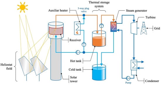 The STP technology is a point-focus solar thermal power plant that consists of the following components: heliostat field; solar tower; receiver; TSS; and power block (Figure 2) [24,26]. The heliostat field is composed of heliostats that reflect solar radiation onto the receiver. The concentrated solar power is absorbed in the receiver, and the energy is transferred to a heat transfer medium [26].