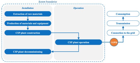 In this paper, the life cycle-based analysis under the standards ISO 14040 [37,38] is performed on three different CSP layouts with a capacity of 100 megawatts (MW) (see Table 2), considering their GHG emissions and water consumption related to 1.0 kilowatt-hour (kWh) of electricity generated in the Brazilian context. Its system boundaries are delimited from the extraction of raw materials to the CSP plant’s decommissioning and final disposal. Note that it does not include transport activities, connection to the distribution network, or transmission lines. This is due to the fact that the CSP technologies considered present the same characteristics for these life cycle stages, and the consumer cannot choose which energy technology is generating its electricity [45]. Following the MATRIZ model requirements, GHG emissions and water consumption were divided into the installation and operation stages (Figure 4).