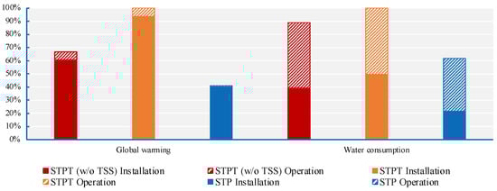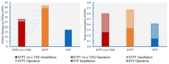When looking at the water consumption, STPT (without TSS) and STPT are associated with 0.60 L/kWh and 0.67 L/kWh, respectively. In the case of STP, the water consumption is estimated to be 0.41 L/kWh. In this impact category, the operation stage of all technologies is responsible for at least 50% of the total water requirements of their whole life cycle. The most significant contributor is the water used to clean mirrors. Figure 5 clearly shows that the installation stage dominates the global warming impact category, whereas the operation stage dominates the water consumption of the three CSP technologies.