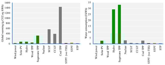 Previous calculations based on data from the Ecoinvent database [35] adapted for Brazil were carried out for the most-used electricity generation technologies in the country (Table 1). They indicate that the most significant contribution to global warming stems from non-renewable alternatives, except nuclear generation. In contrast, hydroelectric generation and sugarcane TPP stand out regarding water consumption.