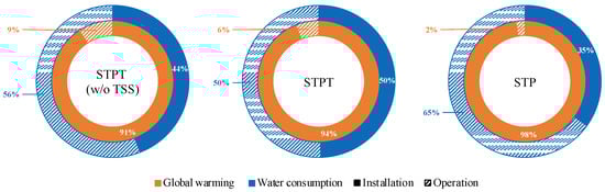 LCIA results for generating 1 kWh of electricity from STPT (w/o TSS), SPTP, and STP.