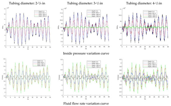The pressure in the tubing decreases with the increase of the diameter, and the peak pressure at the initial end of the three diameters was 12.67 MPa, 11.78 MPa and 10.82 MPa, respectively, with the peak pressure in the 4-1/2″ tubing decreasing by 15% compared to the 2-7/8″. At the same time, the inside pressure also decreases gradually with increasing depth. In the 2-7/8″ tubing, the inside pressure at 1500 m depth is only 9.65 MPa, compared to the initial end of the same diameter tubing, it dropped near 24%. This was due to the fact that the pressure variation exists near the wellhead tubing, and it is reduced by friction when transmitted inside the tubing, and the pressure variation is weakened when it is transmitted downhole. Although the internal pressure decreases as the diameter increases, the frequency of change is significantly faster.