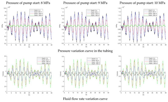 When different initial pressures were applied to the 3-1/2″ inner diameter tubing, the calculation results of the pressure variation parameters were shown in Figure 2. For the same size of tubing, the stress amplitude of the inside pressure would be different for different initial pressures, but the frequency of the pressure was similar. The higher the initial pressure, the higher the inside pressure amplitude. The corresponding peak values were 10.20 MPa, 11.28 MPa, and 12.30 MPa at the pump start pressure of 8 MPa, 9 MPa, and 10 MPa, respectively. The flow field pressure when starting the pump with 10 MPa was increased nearly 21% compared to the same operation with 8 MPa. At the same time, the pressure gradient decreases from wellhead to downhole in order, with the inside pressure at the wellhead being the maximum.