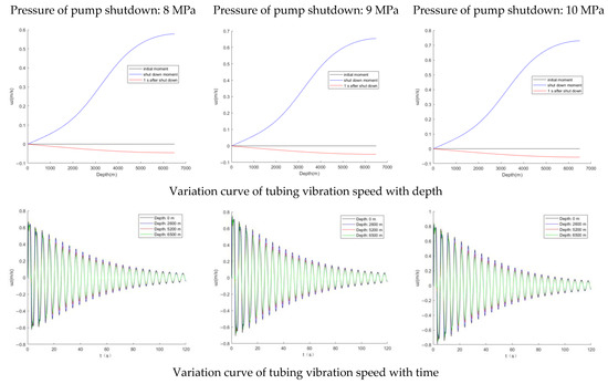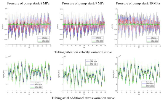 According to the calculation results in Figure 9 and Figure 10, the variation curves of tubing vibration speed and axial additional stress were obtained when the pump was stopped after giving different initial pressures to the downhole tubing at the same time. In this paper, the vibration parameters of the tubing at 8 MPa, 9 MPa, and 10 MPa were calculated, respectively.