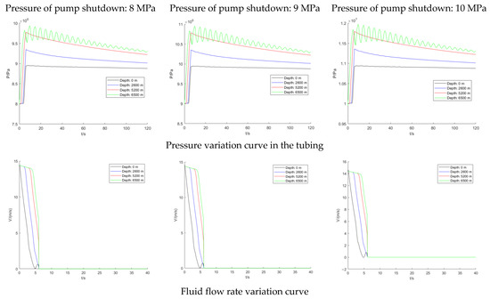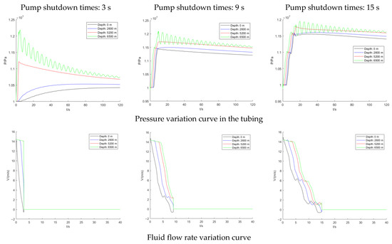 When the initial pump shutdown pressure of the surface pipeline is 10 MPa and the pump stop time is 3 s, 9 s, and 15 s, the variation curve of the parameters of pressure and flow velocity in the tubing with time is calculated with different pump shutdown times of the 6500 m pipeline, as shown in Figure 5. Both tubing pressure and flow velocity will fluctuate at the instant of pump stop. For the pressure inside the tubing, when the pump shutdown occurs, the tubing pressure would increase rapidly in a short time during the process. The tubing pressure would be reduced after the pump stops. In the whole time domain of numerical fluctuation, the pressure in the bottomhole tubing was the highest. When the pump was shut down for 3 s, the pressure in the bottomhole tubing could rise to 12.2 MPa at its highest. It also decreases along the line to the wellhead. Additionally, the longer the pump stop time, the smaller the peak fluctuation of pressure in the tubing, and the inverse relationship.