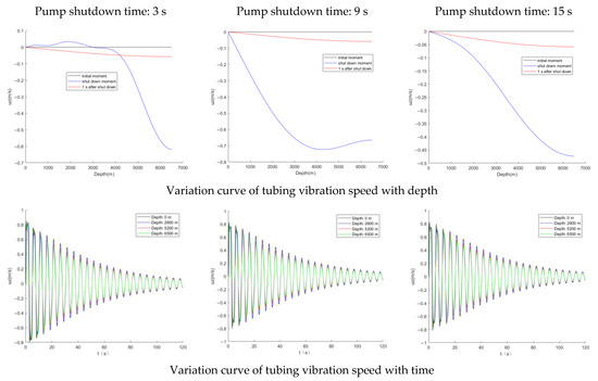 As can be seen from Figure 7, at the time of well shutdown, if the operation time was 3 s, then the tubing would shake violently, and the phenomenon of flickering occurs from the wellhead to 3000 m downhole, where the reverse vibration speed appears. In contrast, the 9 s and 15 s vibration speeds were not affected by the above phenomenon. At the time of pump shutdown, the overall tubing vibration speed along the pipeline to the bottom of the well was increasing in trend distribution.