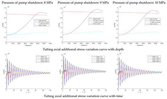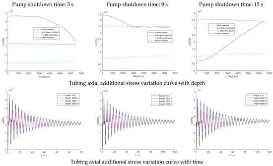 For the axial additional stress of the tubing, it could be seen from Figure 8 that the shorter the time of pump shutdown, the higher the instantaneous load at the wellhead. At 3 s of pump shutdown, the axial additional stress at the wellhead could reach 66 MPa, which was 8.5 times higher compared with 7 MPa at 15 s. Additionally, as the time of pump shutdown increases, the stress increase due to tubing resonance manifests itself at the bottom of the well. The longer the tubing length, the lower the intrinsic frequency, the more likely it was to resonate, and the superposition of the resonance-induced axial stresses would lead to higher stresses at the bottom of the well than wellhead. The stress at the bottom of the well at the 15 s pump shutdown in this paper was close to 35 MPa, much higher than wellhead.