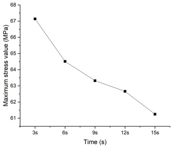The severe impact caused by the transient load when the pump set valve is closed is the main form of tubing damage under pump shutdown conditions, and the tubing will generate very strong axial additional stresses. At this time, the tubing diameter size, pump shutdown time, and the pressure during pump shutdown will have an impact on the additional axial stress of the tubing [25]. Figure 12 shows the peak axial stresses for different tubing diameters at the same stopping time and shutdown pressure, and it can be observed that the larger the tubing diameter is, the higher the additional axial stresses are. The peak stress of the 2-3/8″ tubing was 57.27 MPa, while the 4-1/2″ tubing was 79.9 MPa, and the stress increase has reached 40%. Therefore, the coarse tubing diameter should be given priority when analyzing the axial stress impact damage during pump shutdown so that vibration damping measures can be applied at the corresponding combined tubing section locations. As can be seen from Figure 13, the shorter the pump shutdown time, the greater the additional axial stress generated. Among them, in Figure 13, the peak value of additional axial stress was 67.14 MPa at 3 s pump shutdown, while it dropped to 62.25 MPa at 15 s, with a dropped of 7% in the selected tubing diameter and working condition. In Figure 14, it could be found that the pressure in the tubing at the time of pump shutdown and the additional axial stress generated by it were close to the proportional linear relationship, in which the peak value of the additional axial stress was 52.32 when the pump shutdown pressure was 8 MPa, and the peak value of the stress was close to 76.7 MPa when the pumping stop pressure increases to 12 MPa, with a growth rate of 47%.
