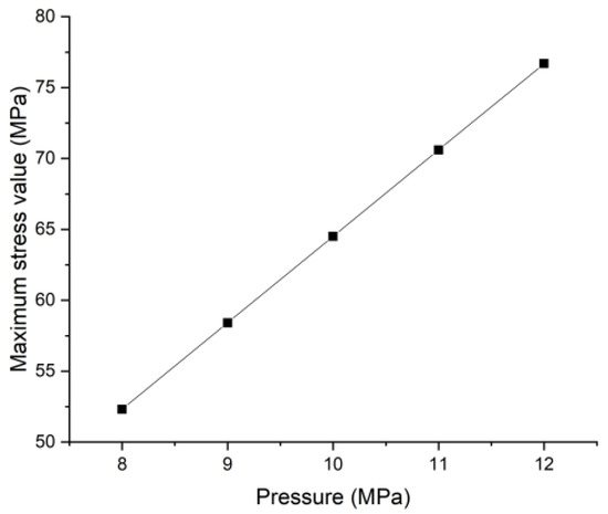 It can be seen from the calculation results of additional axial stress that the maximum value of additional axial stress increases with the increase of initial pressure. When the pump was started at 8 MPa, the maximum axial additional stress of the tubing was 34 MPa, while when the pump was started at 10 MPa, the axial additional stress was close to 40 MPa, with an increase of 18%. The stress value at the bottom of the hole was the highest, and the closer it was to the wellhead, the smaller it was.