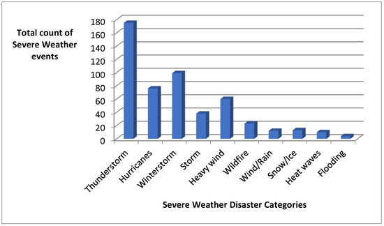 Most of the natural disasters were linked with severe weather conditions. Among those disaster types, the occurrence of a few was higher than the others, such as thunderstorms, hurricanes and winter storms. Figure 2 shows the frequency of the top 10 most frequently occurring disaster categories over the entire period of 17 years. It can be observed that all those disaster categories were related to severe weather conditions.