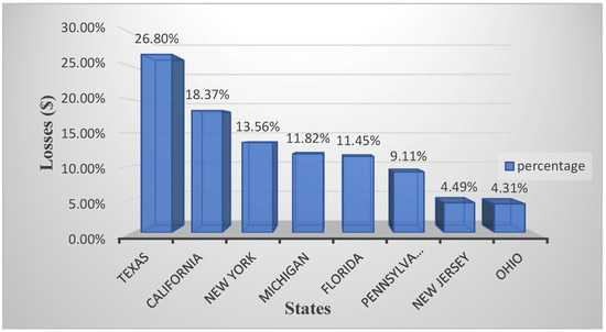 Having found that the major percentage of electric power revenue losses of 70% was due to severe weather disasters, we look into the revenue loss distribution among individual States of the U.S. It was found that more than 85% of the total revenue loss was witnessed by eight States of the U.S. Figure 6 shows the percentage distribution of the accumulated revenue loss in the top eight States (i.e., 85% of total revenue loss), among the individual States.