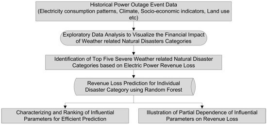 For revenue loss prediction in the case of the occurrence of a severe weather disaster, machine learning (ML) algorithms were considered. ML algorithms are based on data-driven approaches to solve the problem. Therefore, it is critical to select the appropriate algorithm which is particularly suitable for the nature of the data. The dataset used in this research is diverse and multidimensional, and also includes outliers. Therefore, it is important to choose an appropriate machine learning algorithm which may perform well on such data. In the literature, several machine learning algorithms have been employed for different applications, such as support vector machines, random forest, decision trees, the artificial neural network, and linear models [12,35,37]. However, random forest (RF) has proved to be the best candidate, particularly in the case of non-linear data with high diversity and outliers, considering multiple research domains [12,17,35,38,39,40,41,42]. The overall flow chart of the research methodology is shown in Figure 8.