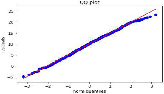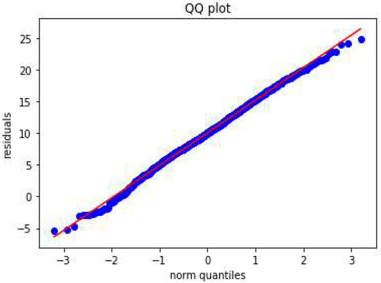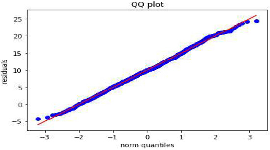 The QQ plot for the winter storm data prediction results is shown in Figure 13, which reveals that the random forest model captures the data variability well, since the residuals fell along the diagonal line.