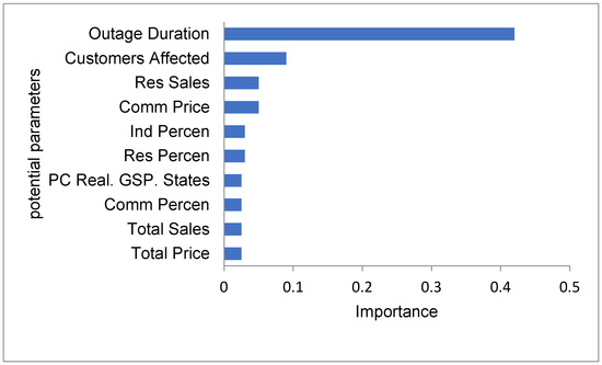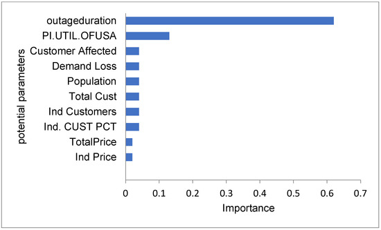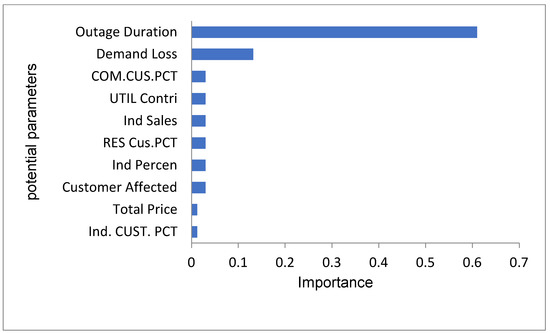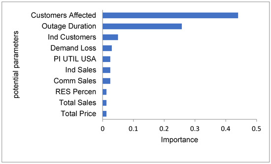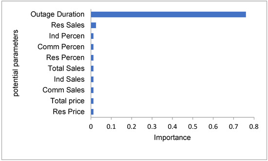 Figure 14 shows the 10 most influential parameters towards an accurate prediction of revenue loss. The outage duration has a normalized importance of 0.46, and this is the highest. The second most important feature is the number of customers affected. Down the list, there are different parameters which contributed equally for prediction.