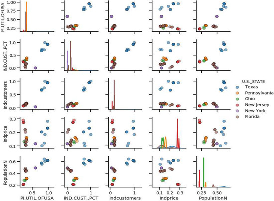 Figure 11 shows the correlation plot between the top five influential features. The plots along the 45-degree line show the mass distribution of a single feature. The remaining plots illustrate the inter-feature correlation. It is observable from scatter plots in the right-most column of the figure that the population parameter has a positive correlation with the rest of the four influential features. Similarly, the contrary case of no correlation can be observed by looking at the scatter-plot between the industrial price feature and the percentage utility of the U.S.