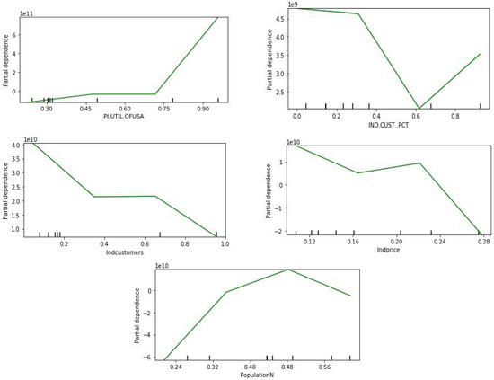The individual partial dependence plots for the top influential features are shown in Figure 12. It can be observed that industrial customers and industrial tariff prices have a negative linear relation with revenue loss in general, except in the middle range where revenue loss increases with a small increase in the price. Similarly, the percentage of the utility industry in the income of the U.S. and the population has a positive relation with revenue loss.