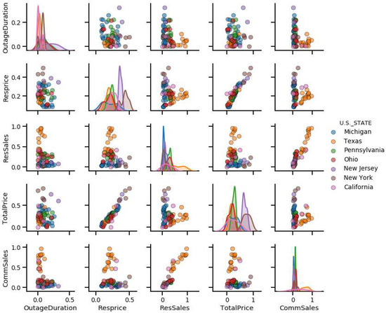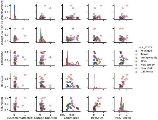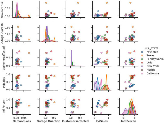 The top five feature correlation plots for the storm disaster category are shown in Figure 23. The density distribution of individual features is shown in the plot along the 45-degree line. In the distribution of industrial customers, it can be observed that most of the data belong to the Michigan State, while the rest of the States have very small sets of data for the distribution. It can also be observed that the features related to the storm category data are mostly uncorrelated.