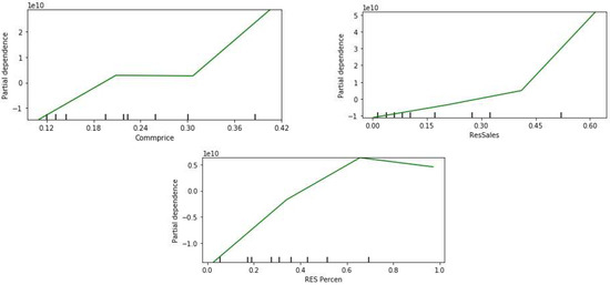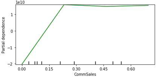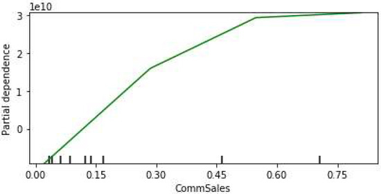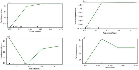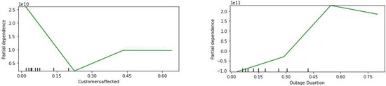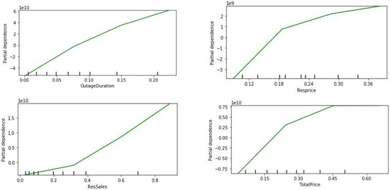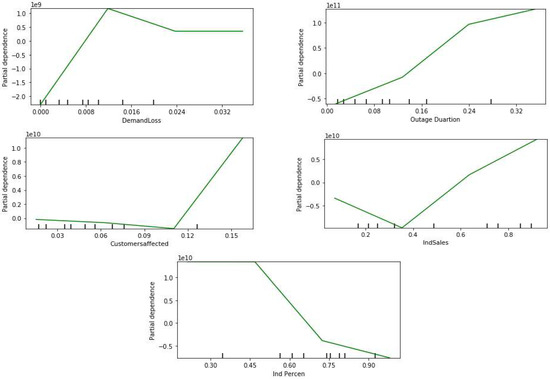 Figure 16 shows the individual partial dependence plots for the top five influential features. It can be seen that the residential sales and the commercial price have a positive relation with the revenue loss. A similar relation can be observed for outage duration and the residential customers’ percentage up to the 60% range; however, the relationship is inverted in the higher range.