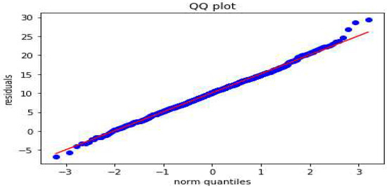 Figure 9 shows the QQ plot for the hurricane data prediction results. It can be observed that residuals fall along the 45-degree line, which reveals that the random forest model captures the data variability well.