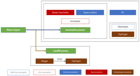 Incineration plants destroy waste at a temperature of 850 °C or higher, and collect the waste heat (400 °C) produced in the process to generate electricity. After that, high-pressure steam, cooled to about 120 °C, is supplied as a local heating source around the incineration plants [25]. Recently, incineration plants, such as sewage treatment plants, have been actively renovated into underground incineration facilities and utilize space on the ground in three dimensions, enabling additional solar power generation on unused sites. In addition, although the land area occupied by the incineration plants is much smaller than that of the sewage treatment plants, the concentration of energy production generated through the incineration of waste is rather high, so hydrogen production by water electrolysis can be undertaken using the power and heat produced. High-efficiency hydrogen production can be performed with a heat source of 120 °C, which is generated in the treatment process [26]. As shown in Figure 3, waste generated in the city is converted into electricity and heat in the incineration system and, if necessary, is produced again as hydrogen.