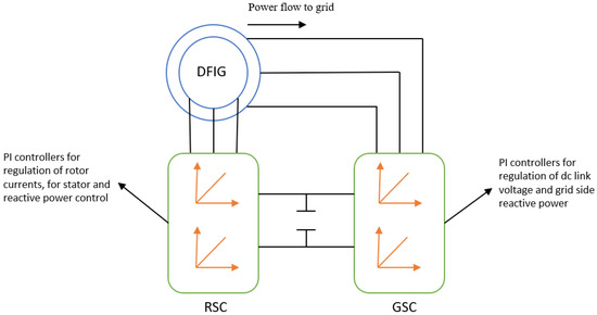 The use of grid-connected wind energy conversion systems has seen a drastic rise in the past two decades. This can be attributed to the rugged and robust performance of synchronous and asynchronous generators [1]. In particular, the doubly fed induction generator has been the machine of choice. This is largely due to factors such as direct grid connection (thereby persevering grid inertia) and the use of only a partially rated power electronic converter [1]. The structure of the DFIG can be observed in Figure 1 [2]. Owing to its various merits, the DFIG has recently come under intense investigation. An example of this is [1,3], whereby the authors analyzed the effect of applying model predictive control to the DFIG, to analyze response time and stead-state characteristics. Another example can be found in [4], where the authors utilized a novel model predictive control method to achieve stringent load frequency control.