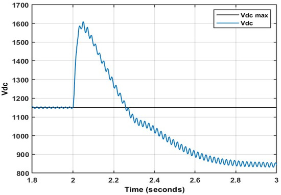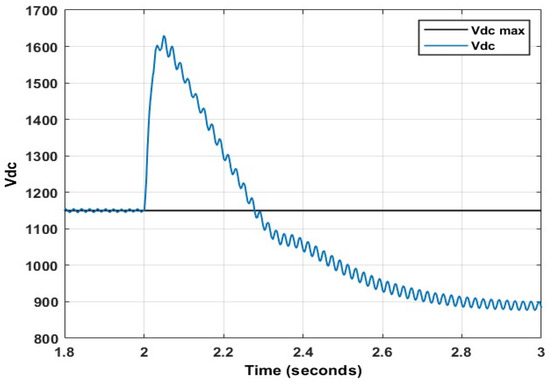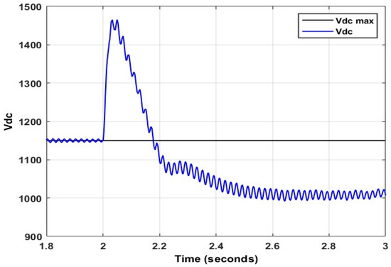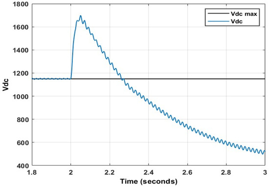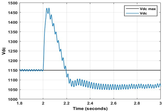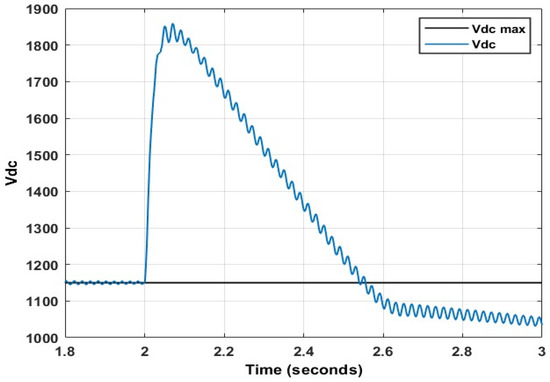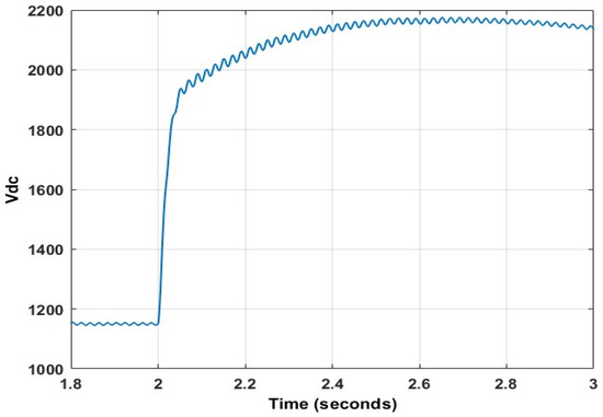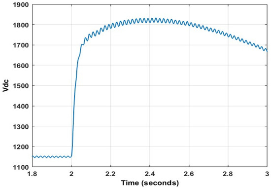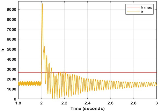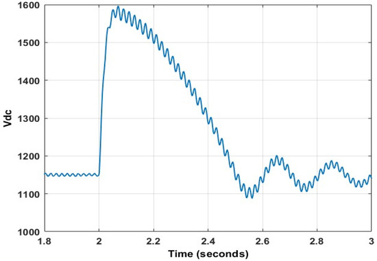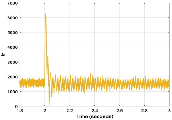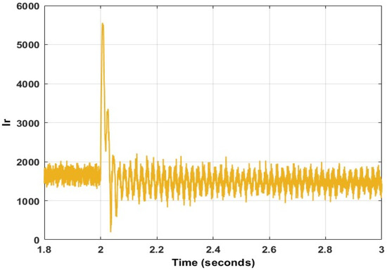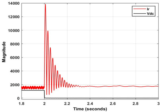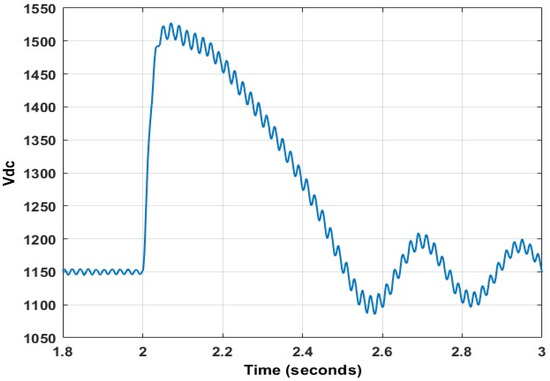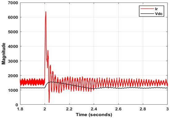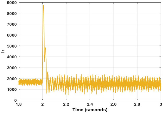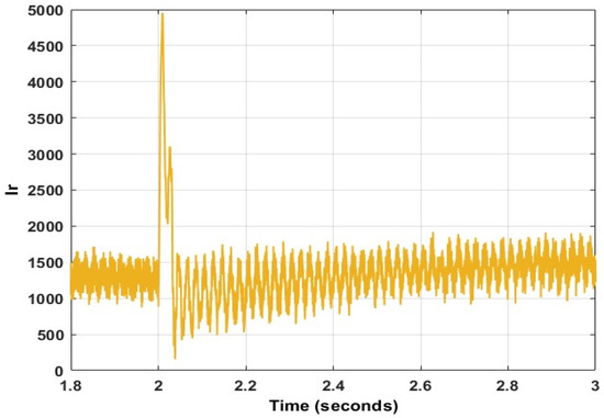 Table 10 indicates the optimized gains for the LQR, considering a voltage dip of 90%. Figure 53 and Figure 54 represent the total rotor current magnitude and DC voltage, respectively, of the LQR. Figure 55 and Figure 56 indicate the rotor direct axis current steady state ripple and steady state error, respectively, of the LQR. From Figure 53, the peak rotor current magnitude is observed to be 7245 A, indicating a superiority of 25.74% over the conventional PI controller. Figure 54 depicts the peak DC voltage as 1834 V, exhibiting a 18.65% better response than the PI controller. The steady-state ripple of the rotor direct axis current, as shown in Figure 55, is 422 A, which is 1.4% inferior to the PI controller. The average steady state value in Figure 56 is 1172 A. This correlates to an error percentage of 21.87%. This error is inferior to the conventional PI controller.