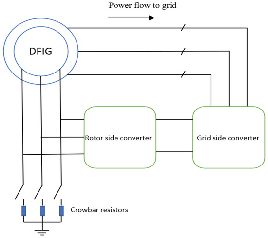 Hence, it is concluded that the crowbar is an effective and ultimately essential method of protection of the DFIG. The crowbar resistors are open circuited during normal operation of the DFIG and are activated via power electronic switches during fault conditions. The topology of the crowbar circuit can be observed in Figure 6 [15].