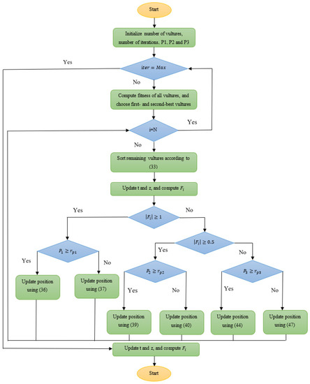 where and are random numbers in the domain [0,1]. As with the exploration phase, the method of exploitation chosen is dependent on a predefined constant, . The value of lies in the domain [0,1]. Thereafter, a random number, also in the domain [0,1], is generated. If the value of is greater than that of the randomly generated number, Equation (39) is utilized. Otherwise, Equation (40) is deployed for exploitation. The second phase of exploitation occurs when the magnitude of is less than 0.5. As with exploration and phase one of exploitation, two possible scenarios exist. First, the fierce competition between vultures for a food source is mathematically modelled. The second scenario expresses the scavenging behavior of the vultures. In such an instance, the remaining vultures move to the position of the best vulture, to salvage the remaining food. These are expressed in Equations (44) and (47) and are as [26,34,35,36]: