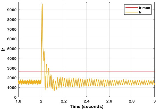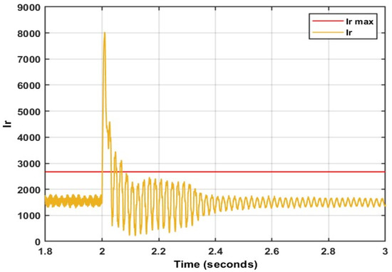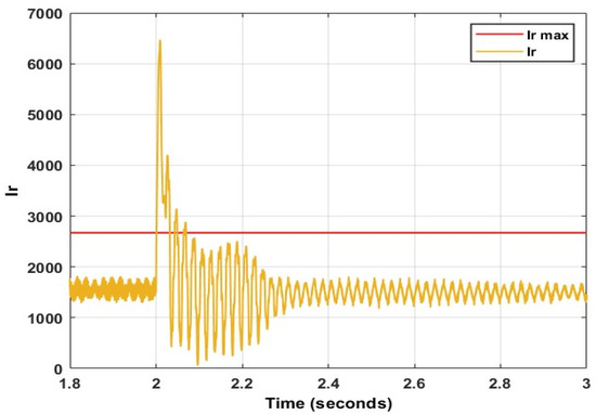 However, despite its many advantages, this direct grid connection has its drawbacks. In the case of a three-phase short-circuit fault, the DFIG reacts sensitively [5,6]. The abrupt change in grid voltage magnitude creates a large transient stator flux [5]. This has the potential to cause drastic overvoltage and overcurrent in the rotor side of the DFIG [5,6]. A common approach to preventing these catastrophic consequences would be to short-circuit the rotor via the use of a crowbar [5,7,8,9]. While this works well, the optimal sizing of the crowbar resistance is challenging. A small crowbar resistance ensures a smaller rotor voltage, but a large spike in the rotor current. Similarly, a large crowbar resistance successfully limits the rotor current, but at the expense of an overvoltage. This is observed in Figure 2 and Figure 3. Therefore, optimal sizing of the crowbar circuit is essential.