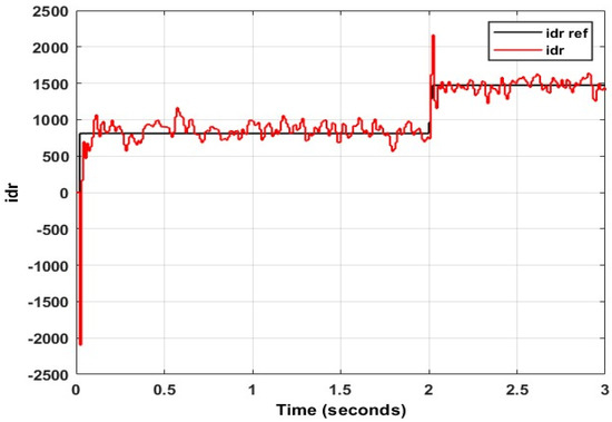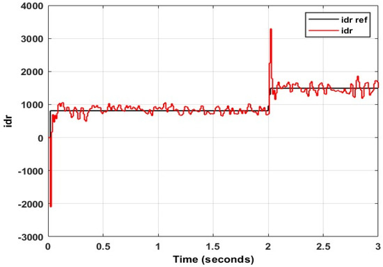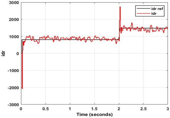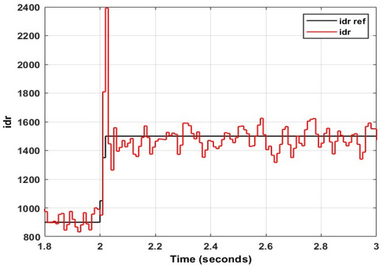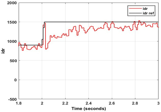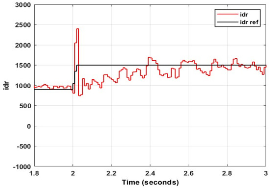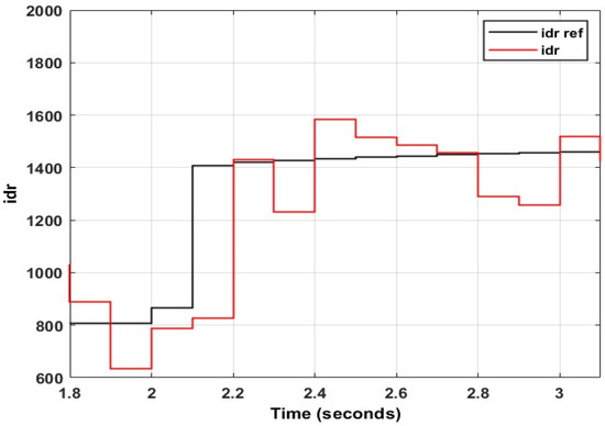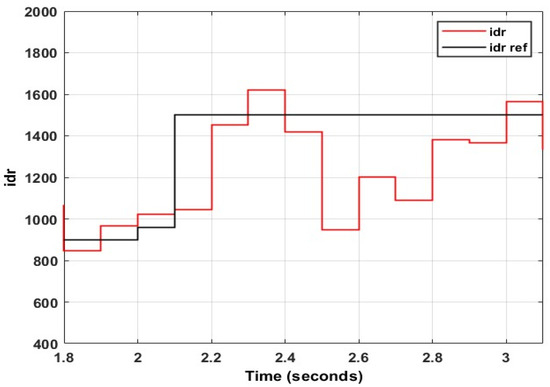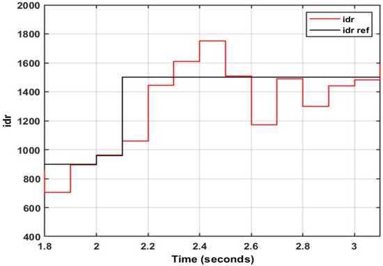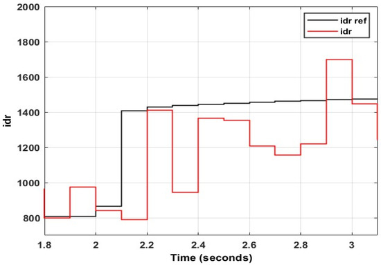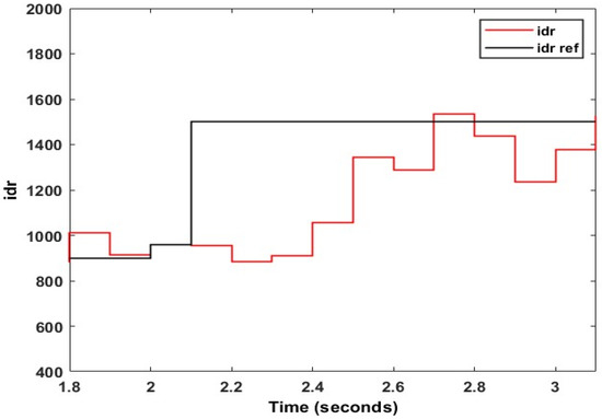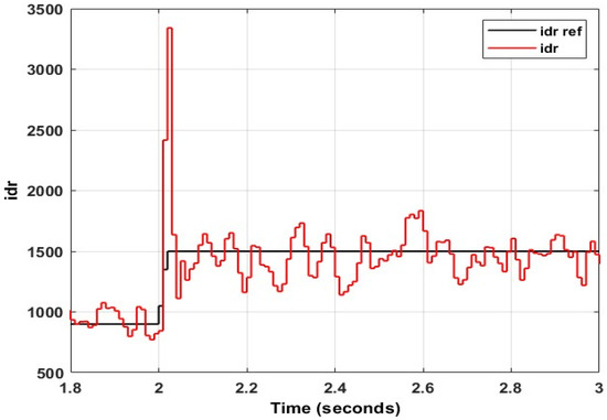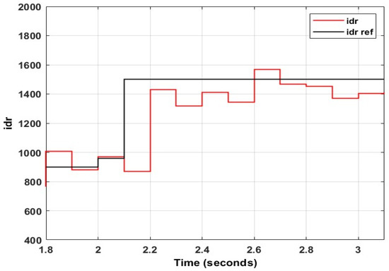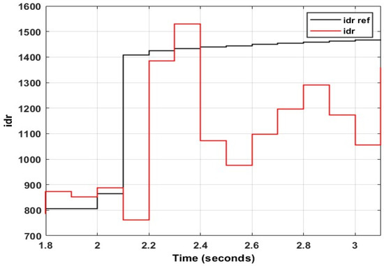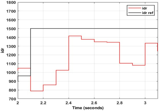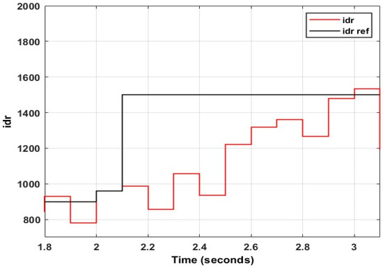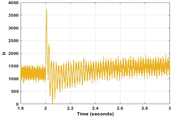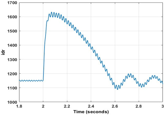 Table 8 indicates the optimized gains for the PI controller, considering a voltage dip of 90%. Figure 45 and Figure 46 represent the total rotor current magnitude and DC voltage, respectively, of the PI controller. Figure 47 and Figure 48 indicate the rotor direct axis current steady state ripple and steady state error, respectively, of the PI controller. From Figure 45, the peak rotor current magnitude is observed to be 9110 A, whereas Figure 46 depicts the peak DC voltage as 2176 V. The steady-state ripple of the rotor direct axis current, as shown in Figure 47, is 416 A, with the average steady state value in Figure 48 at 1438 A. This correlates to an error percentage of 4.3%.