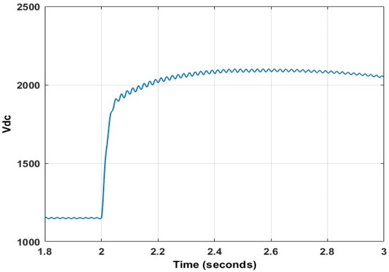 Table 9 indicates the optimized gains for the DCI, considering a voltage dip of 90%. Figure 49 and Figure 50 represent the total rotor current magnitude and DC voltage, respectively, of the DCI. Figure 51 and Figure 52 indicate the rotor direct axis current steady state ripple and steady state error, respectively, of the DCI. From Figure 49, the peak rotor current magnitude is observed to be 8679 A, indicating a superiority of 25.74% over the conventional PI controller. Figure 50 depicts the peak DC voltage as 2137 V, exhibiting a 18.65% better response than the PI controller. The steady-state ripple of the rotor direct axis current, as shown in Figure 51, is 667.5 A, which is 60.46% inferior to the PI controller. The average steady state value in Figure 52 is 1230.17 A. This correlates to an error percentage of 16.42%. This error is inferior to the conventional PI controller.