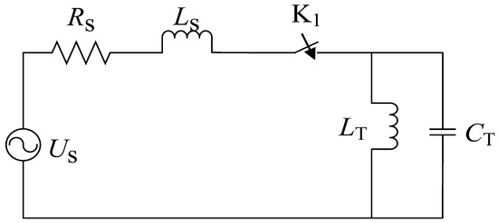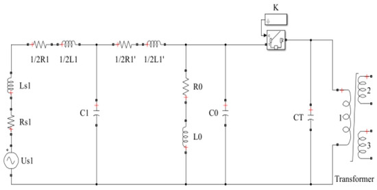 The induced current has no sudden change; therefore, the LT branch of the vehicle-mounted transformer’s magnetic inductance is equivalent to an open circuit and is not calculated when the vehicle-mounted circuit breaker is closed. The system power supply supplies power to the no-load, vehicle-mounted transformer to charge its winding and ground stray capacitance when circuit breaker K1 is closed. The equivalent capacitance value is small, and the conversion of energy produces high-frequency oscillation in the loop. In Figure 1, the circuit equation of K1 at the moment of closing is as Equation (2) [17].